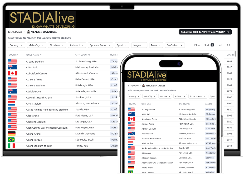 STADIAlive delivers the most comprehensive sports venue intelligence platform available, providing you with meticulously curated data that goes far beyond basic facility information. From breaking venue developments to the teams and leagues that bring these spaces to life, our platform gives you the complete picture.