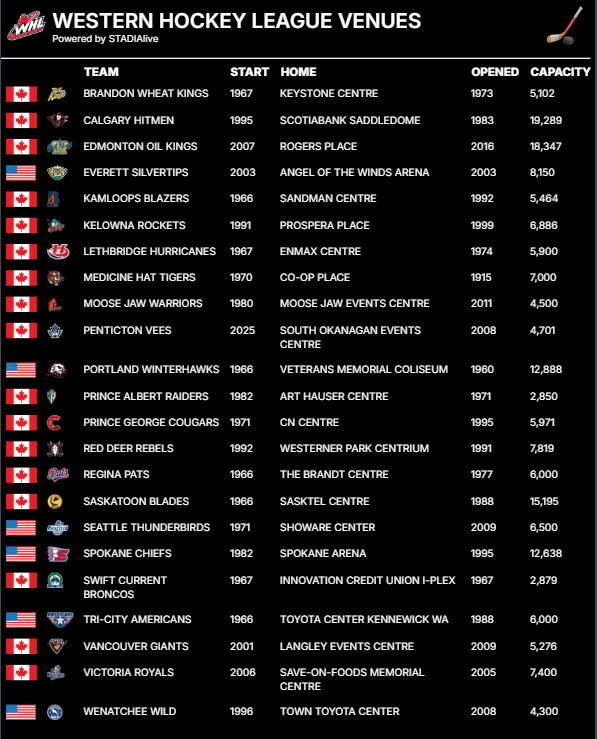 WHL teams currently compete in a wide range of venues, reflecting the league’s geographic diversity and local-market dynamics. From mid-sized urban arenas in cities like Calgary, Edmonton, and Vancouver to community-centric facilities in Penticton and Chilliwack, the infrastructure supports strong attendance, grassroots engagement, and the league’s development-focused mission. These arenas serve as economic anchors in many markets, contributing to downtown activity and reinforcing the WHL’s role in regional sports culture.